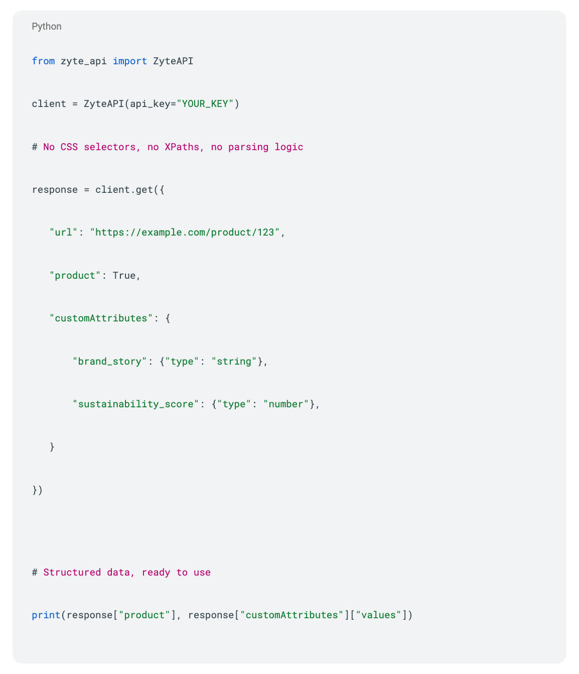 But here's the key: you maintain complete control over what actually matters. You define custom attributes for any data fields beyond the standard schemas. You control data quality standards and validation logic. You decide when to use AI extraction versus when to fall back to custom parsing for edge cases – it's as easy as adding a single argument to the above snippet to request the page HTML.